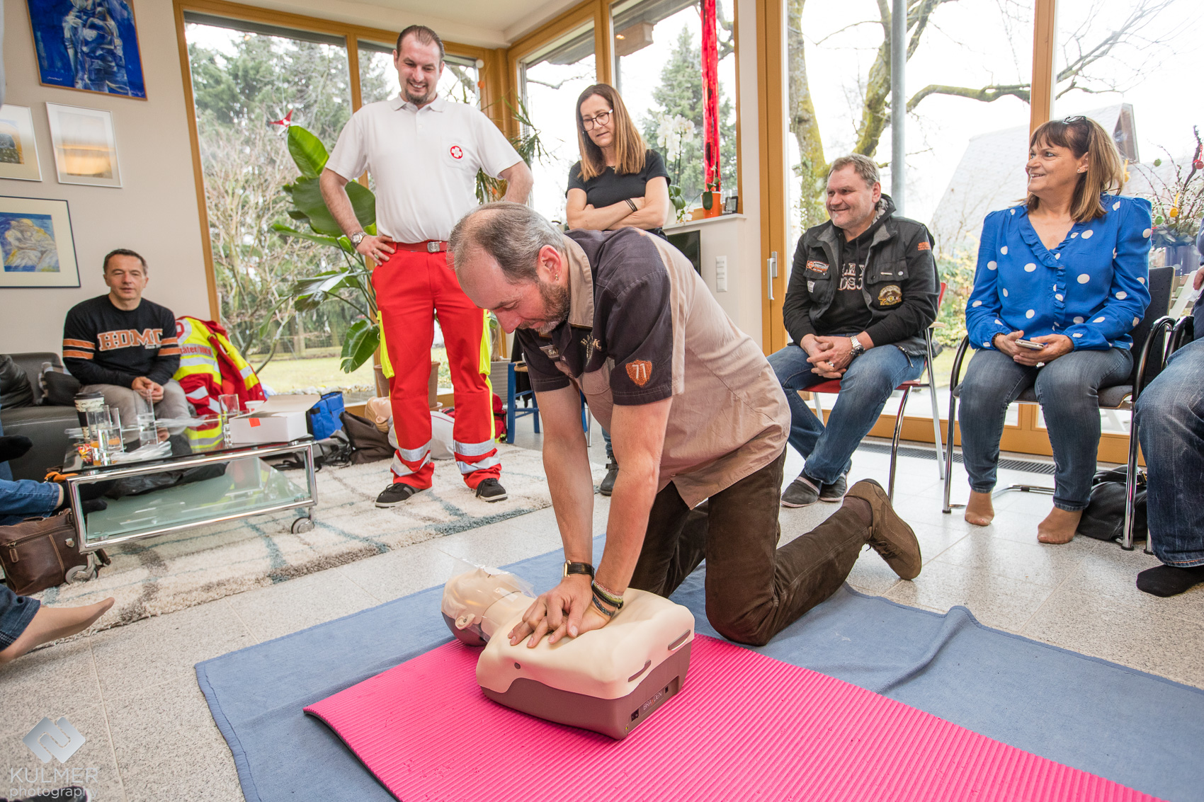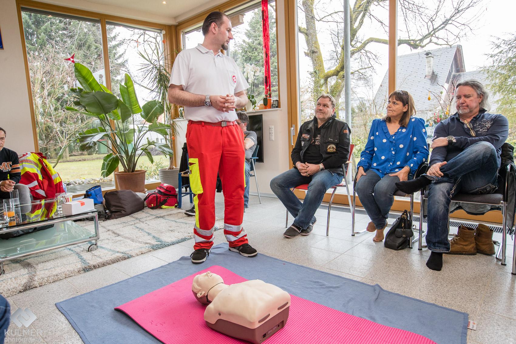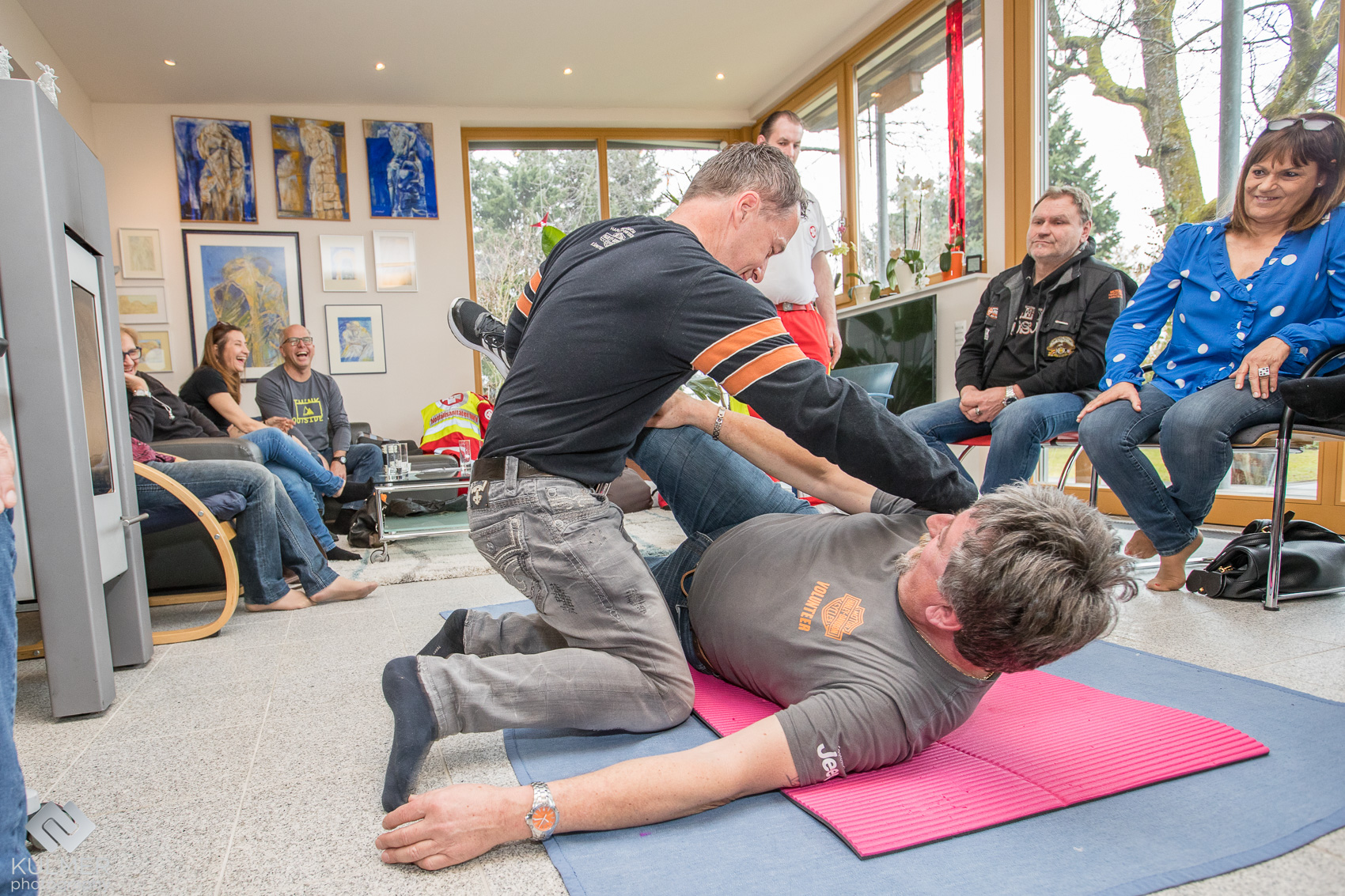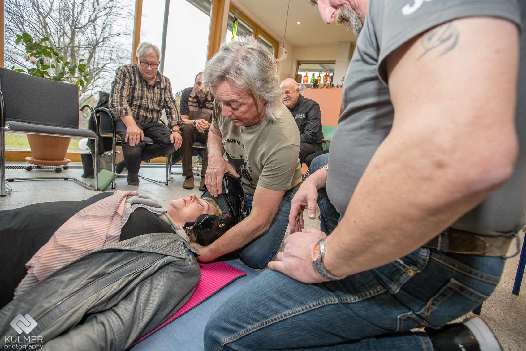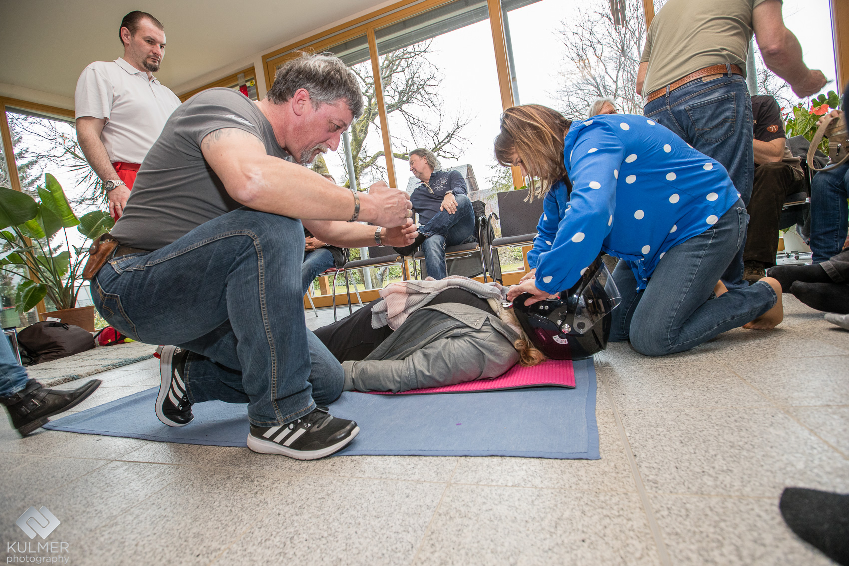 Viele der Chaptermitglieder fanden sich am 17.3.2018 bei Walter im Haus ein um am Erste-Hilfe-Kurs teilzunehmen. Wir wurden von einem Mitarbeiter des Samariterbund, Christoph Messner der tatkräftig von Heinrich Offner unterstützt wurde, in die erste Hilfe eingewiesen. Das Helm abnehmen, die Seitenlage, die Herzmassage bis hin zur Mund zu Mund Beatmung, den Verband und die Schiene anlegen, es war alles enthalten.
