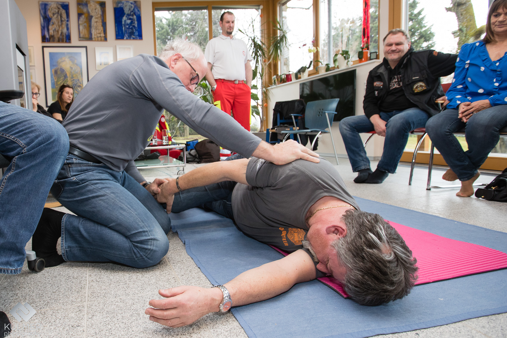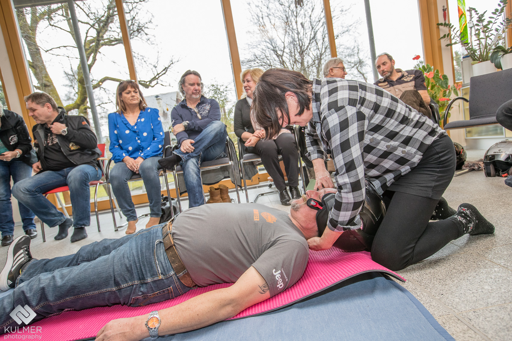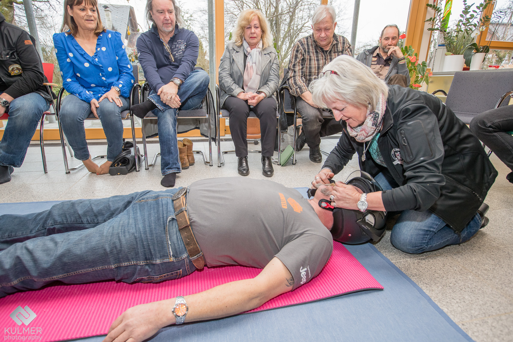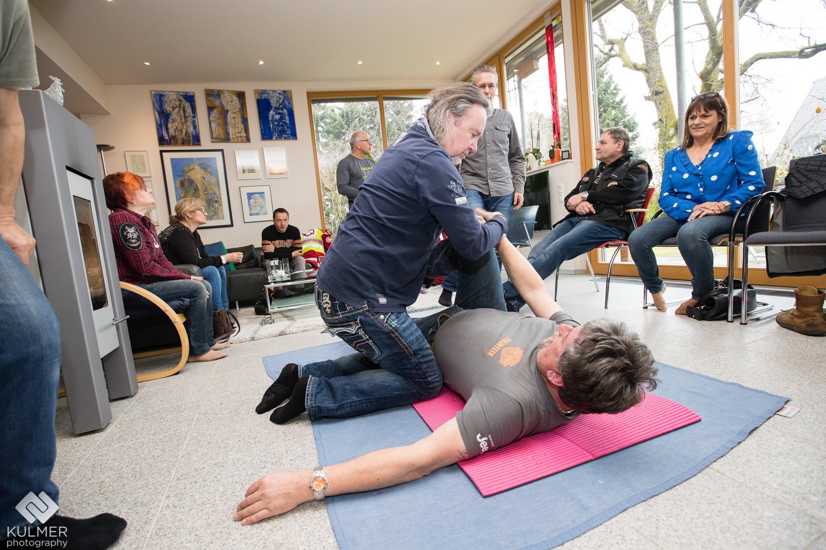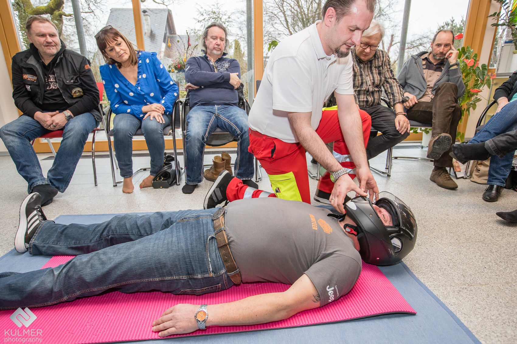 Viele der Chaptermitglieder fanden sich am 17.3.2018 bei Walter im Haus ein um am Erste-Hilfe-Kurs teilzunehmen. Wir wurden von einem Mitarbeiter des Samariterbund, Christoph Messner der tatkräftig von Heinrich Offner unterstützt wurde, in die erste Hilfe eingewiesen. Das Helm abnehmen, die Seitenlage, die Herzmassage bis hin zur Mund zu Mund Beatmung, den Verband und die Schiene anlegen, es war alles enthalten.