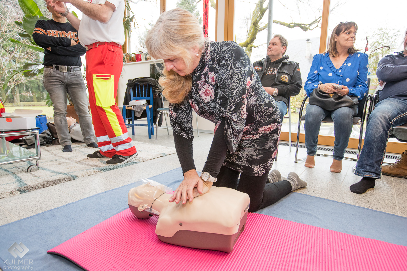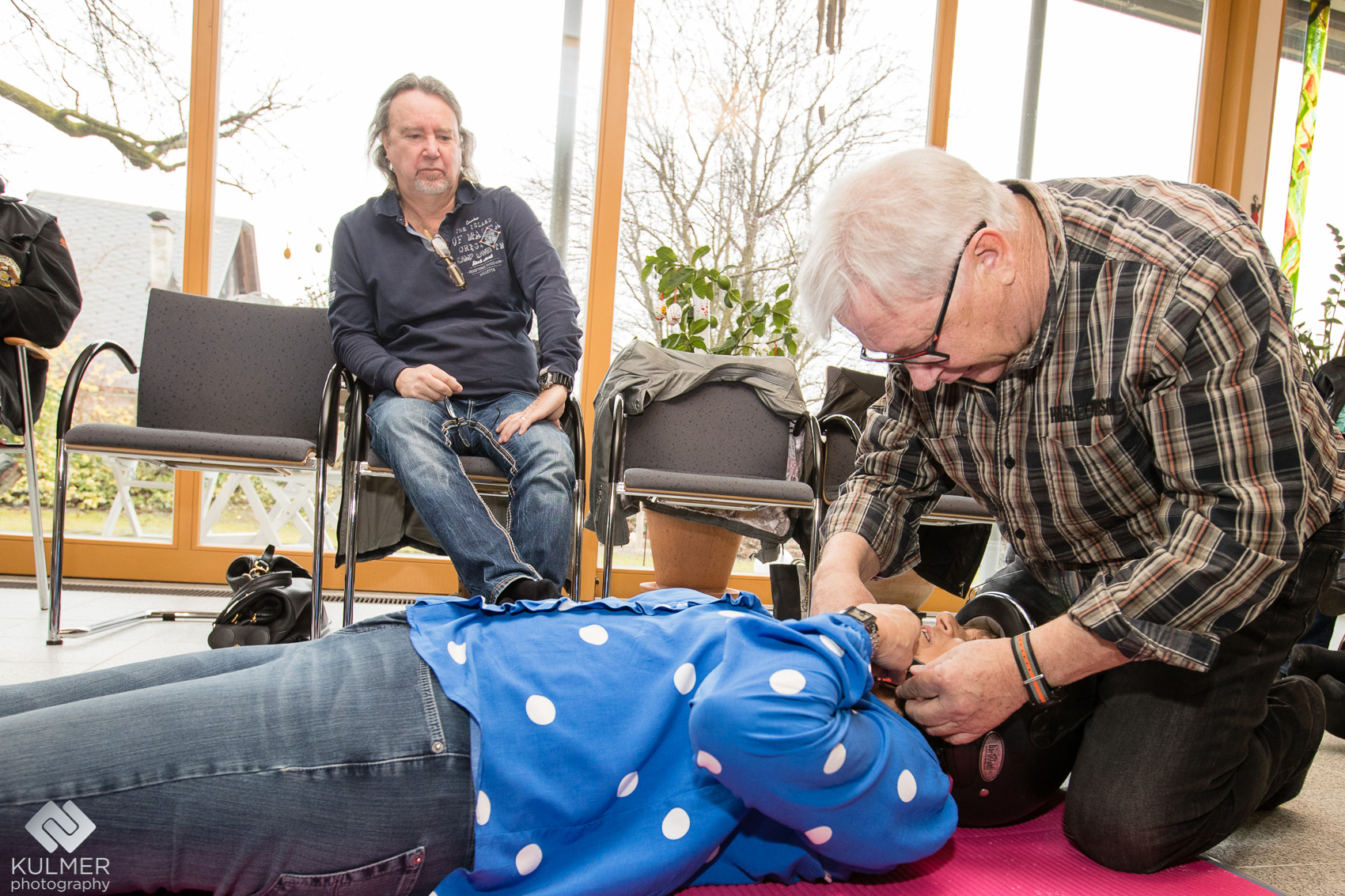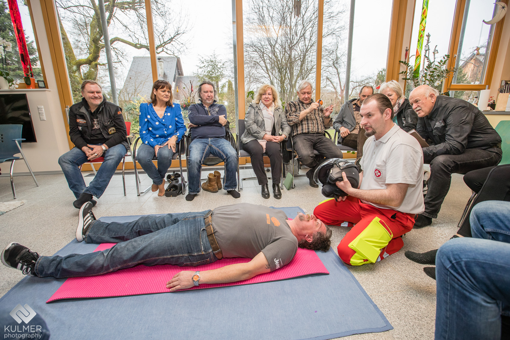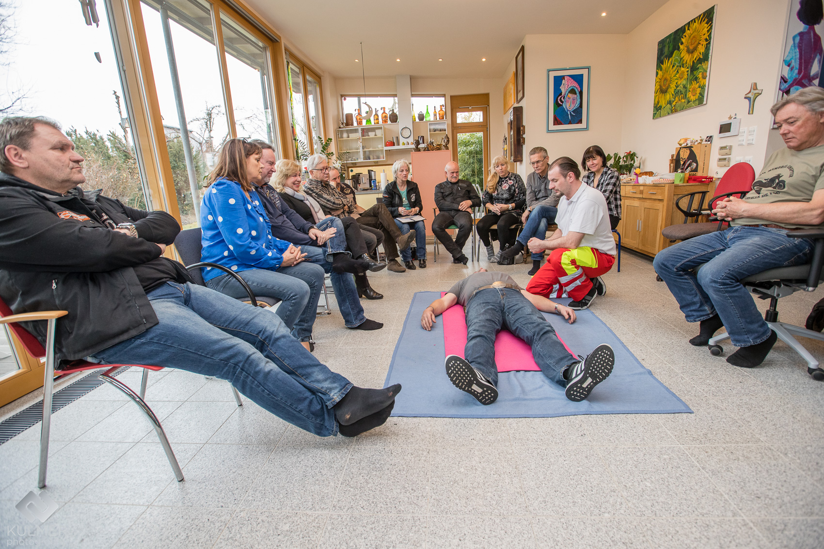 Viele der Chaptermitglieder fanden sich am 17.3.2018 bei Walter im Haus ein um am Erste-Hilfe-Kurs teilzunehmen. Wir wurden von einem Mitarbeiter des Samariterbund, Christoph Messner der tatkräftig von Heinrich Offner unterstützt wurde, in die erste Hilfe eingewiesen. Das Helm abnehmen, die Seitenlage, die Herzmassage bis hin zur Mund zu Mund Beatmung, den Verband und die Schiene anlegen, es war alles enthalten.