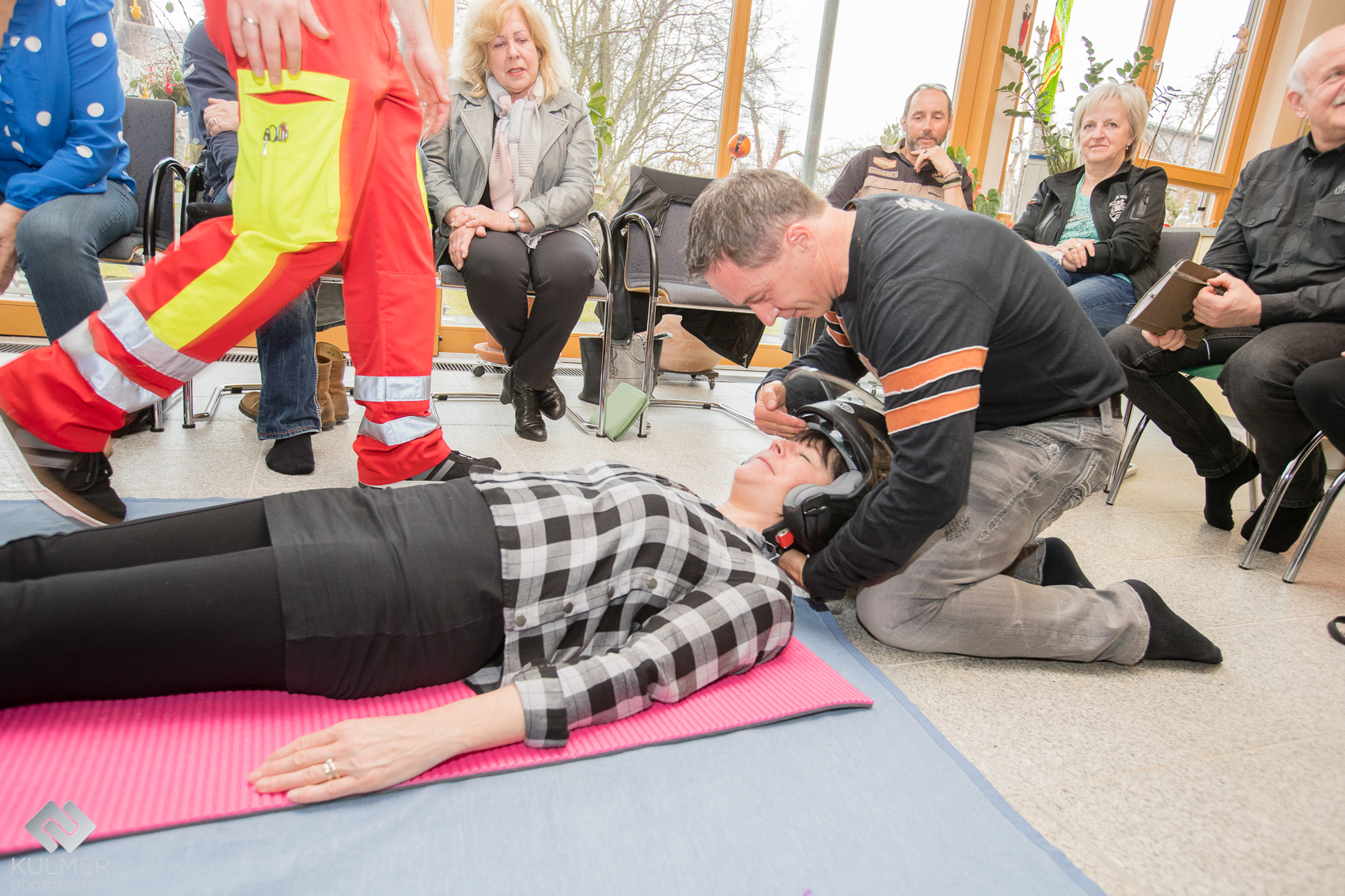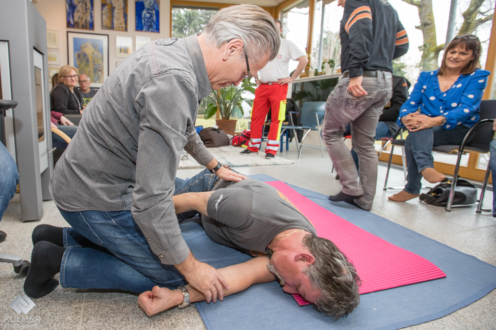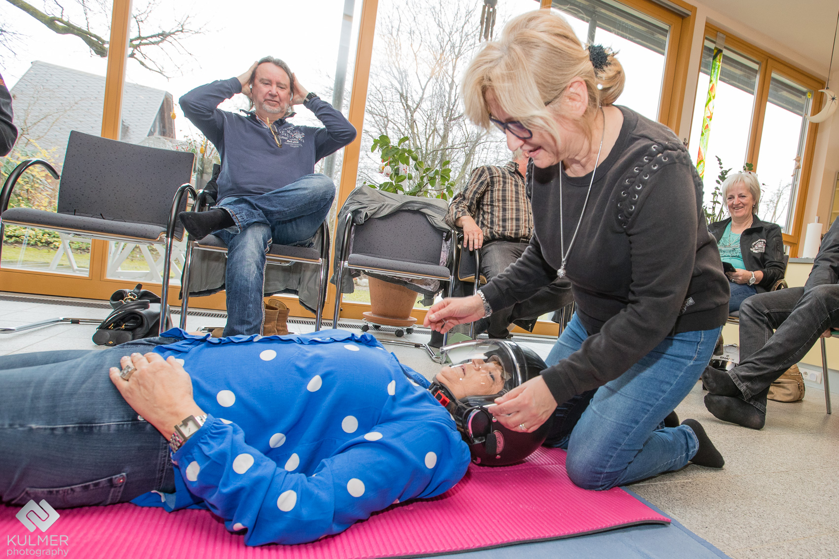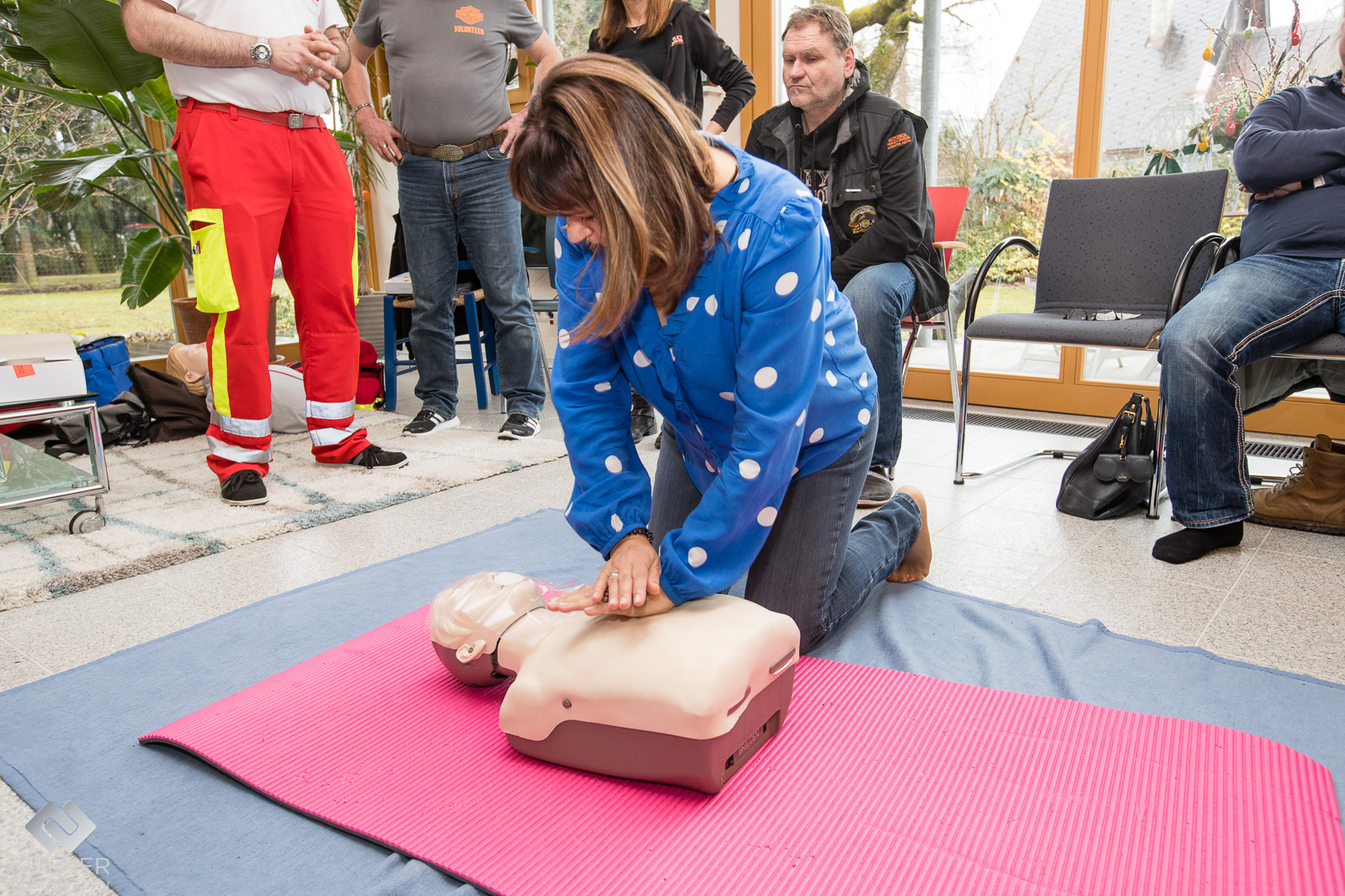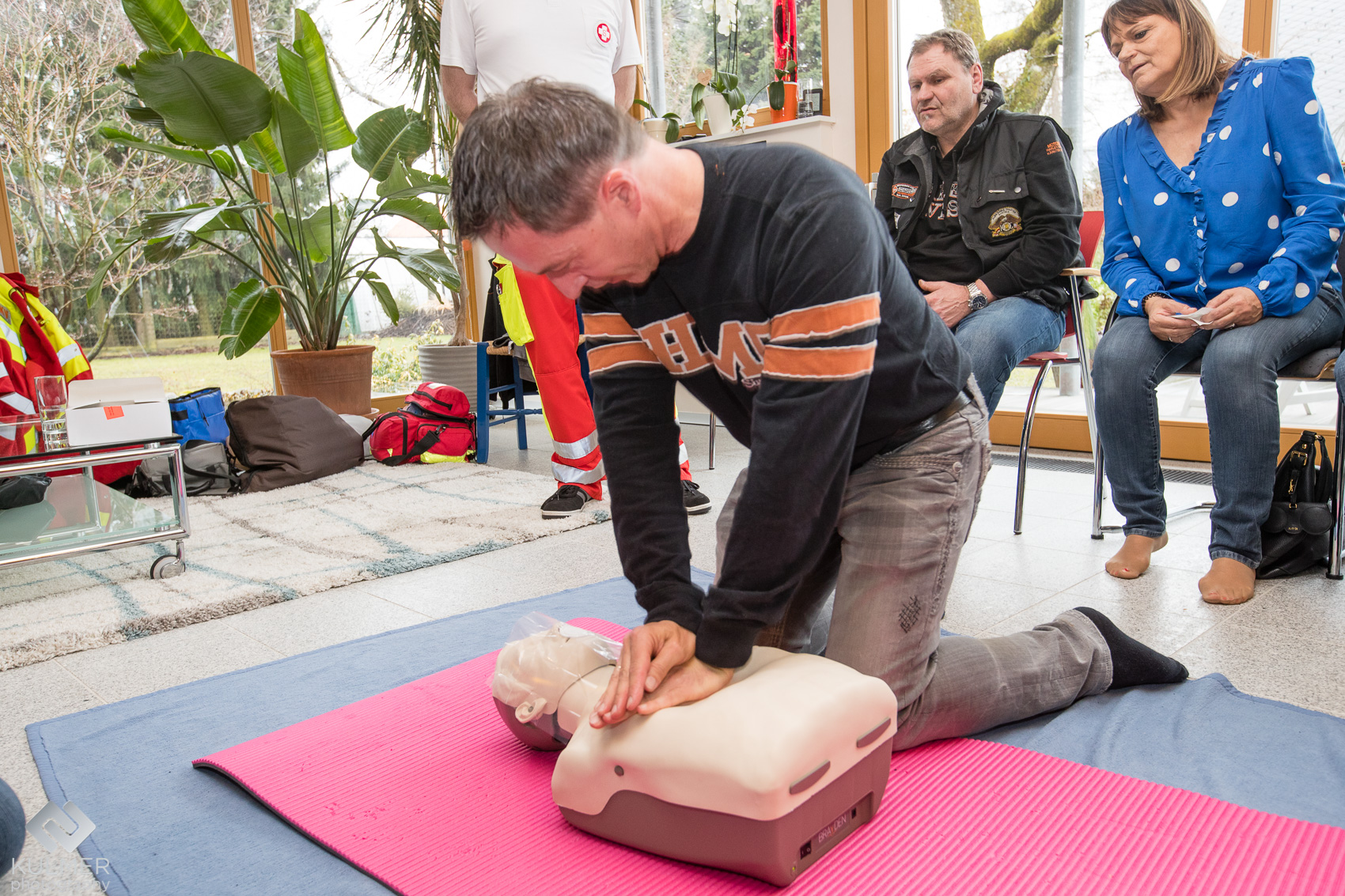 Viele der Chaptermitglieder fanden sich am 17.3.2018 bei Walter im Haus ein um am Erste-Hilfe-Kurs teilzunehmen. Wir wurden von einem Mitarbeiter des Samariterbund, Christoph Messner der tatkräftig von Heinrich Offner unterstützt wurde, in die erste Hilfe eingewiesen. Das Helm abnehmen, die Seitenlage, die Herzmassage bis hin zur Mund zu Mund Beatmung, den Verband und die Schiene anlegen, es war alles enthalten.