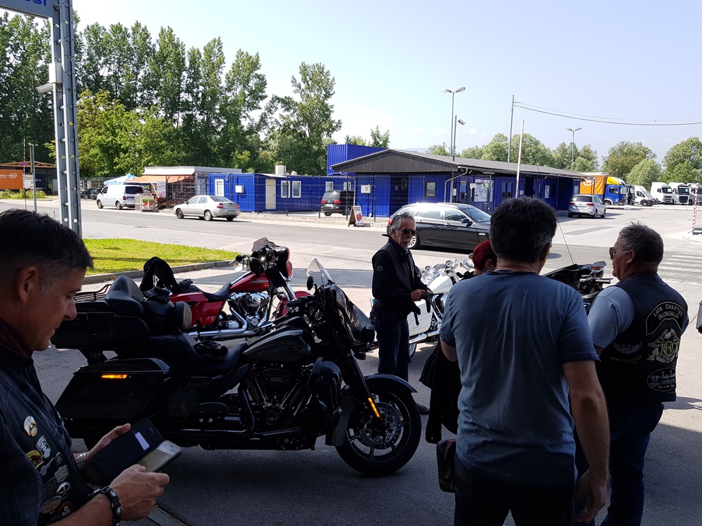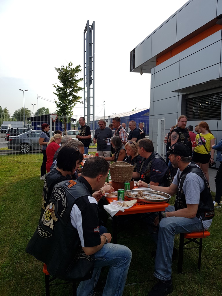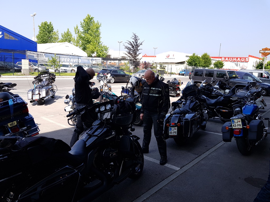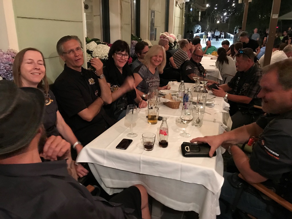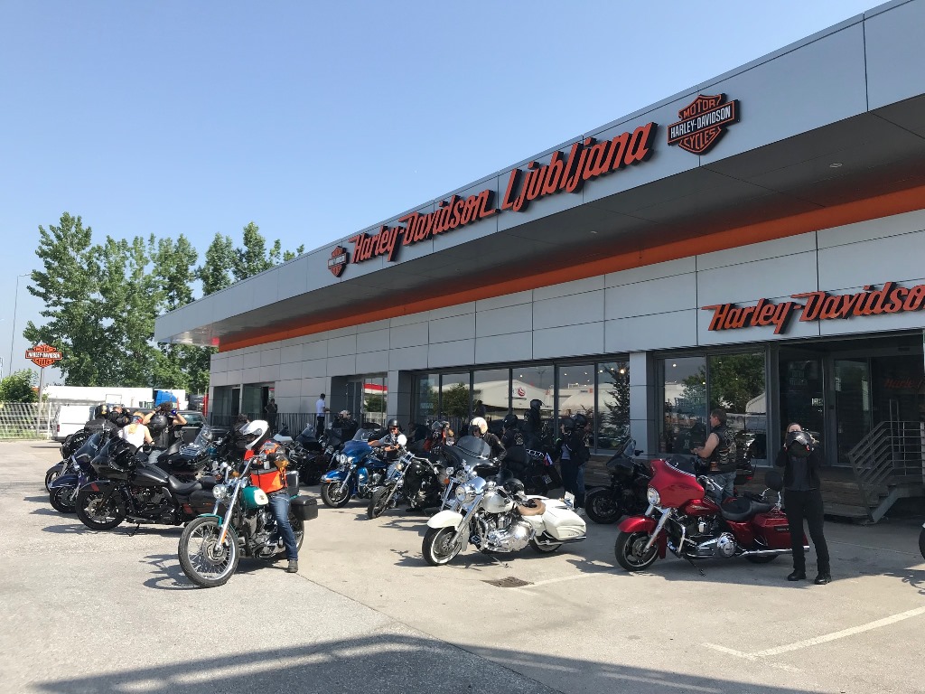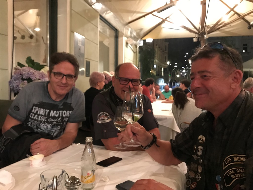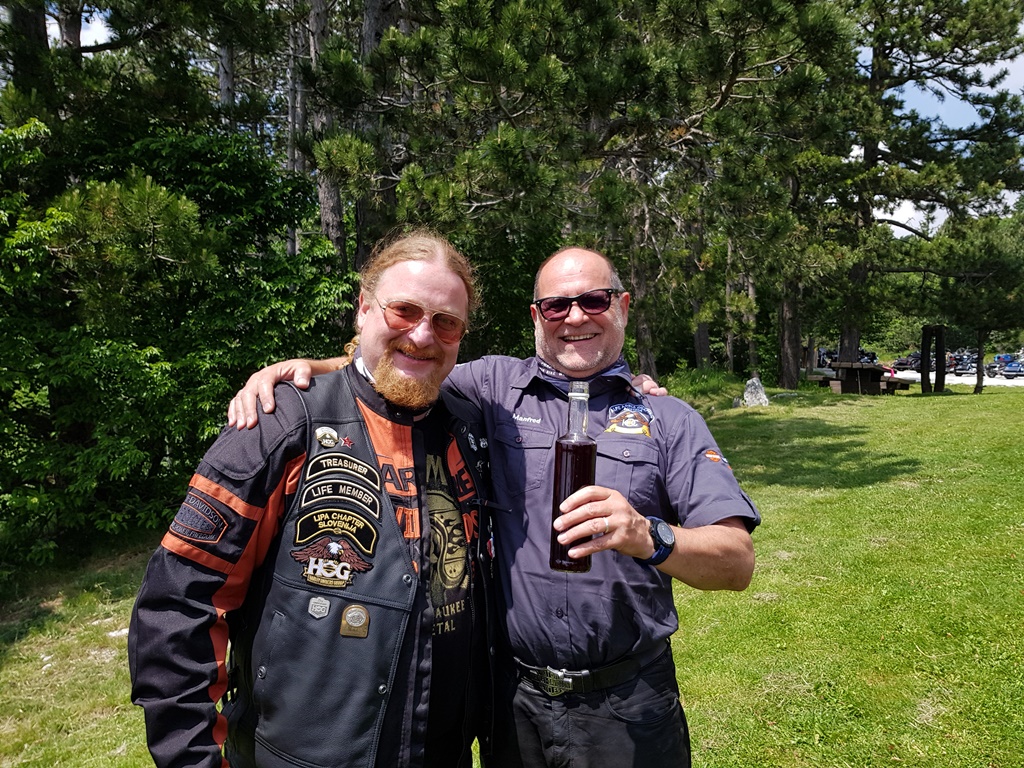 Die Anreise führte über den, offiziell gesperrten, Seebergsattel zur Mittagspause nach Dvorje. Danach ging es weiter nach Ljubljana ins Hotel zum Check-in. Am Abend besuchten wir das LIPA-Chapter beim örtlichen Harley-Dealer. Wir wurden freundlich empfangen und gleich zum Spanferkelschmaus, Kotelett und Cevapcici eingeladen. Grund dafür war auch der Geburtstag des Directors. Bei gutem Essen und ein paar Glas Wein oder Bier machten wir die Tour für den nächsten Tag aus.
