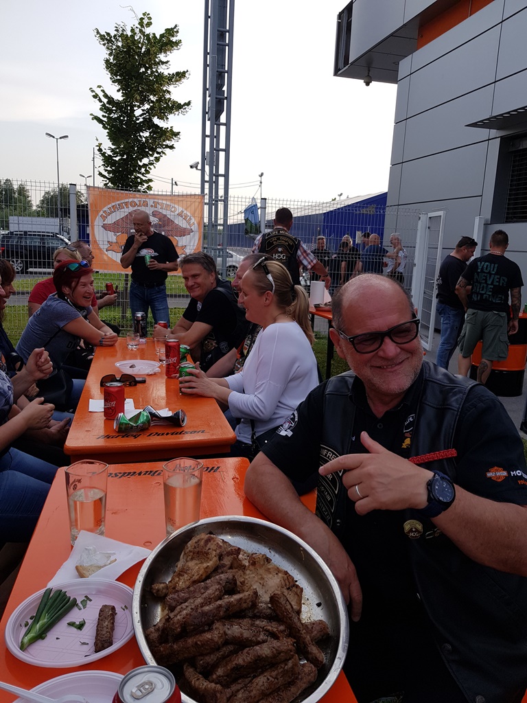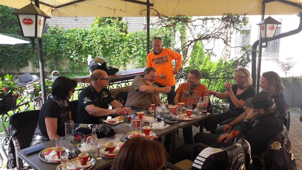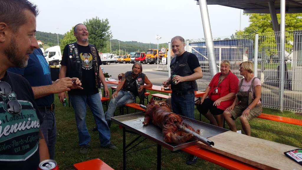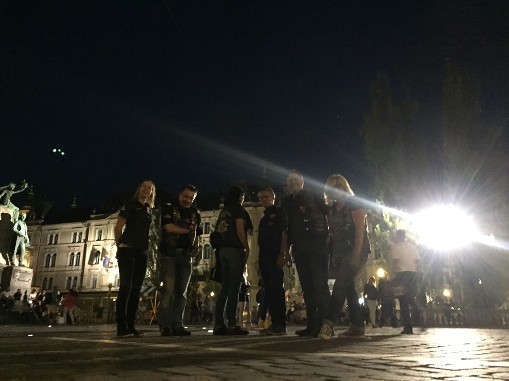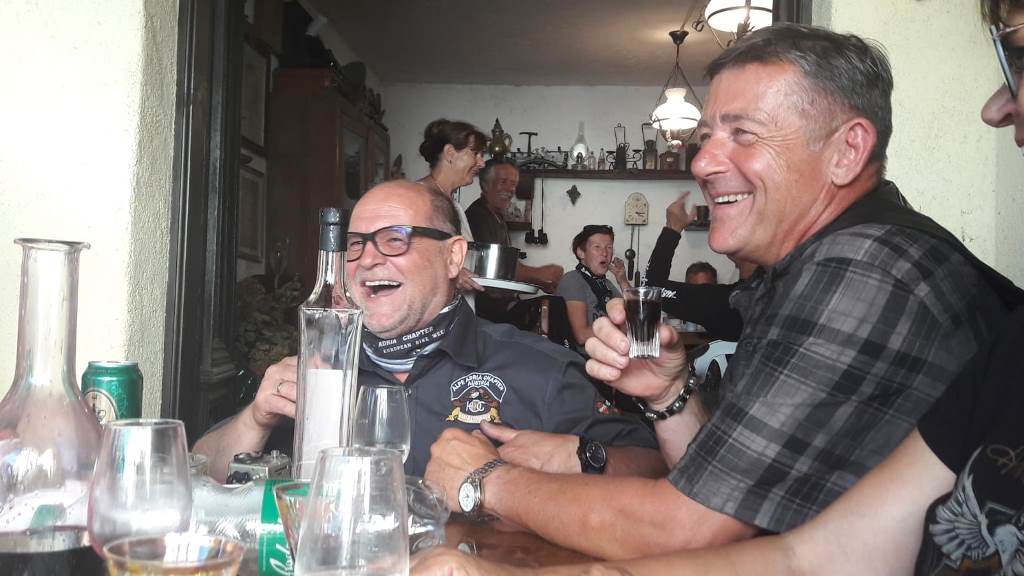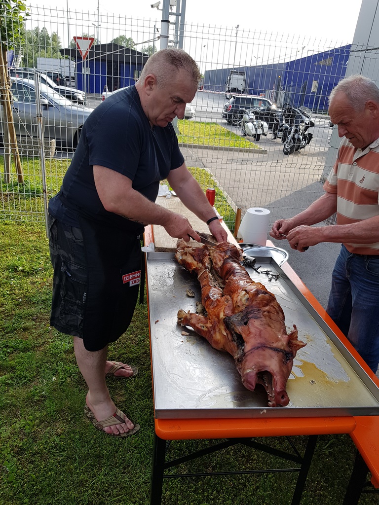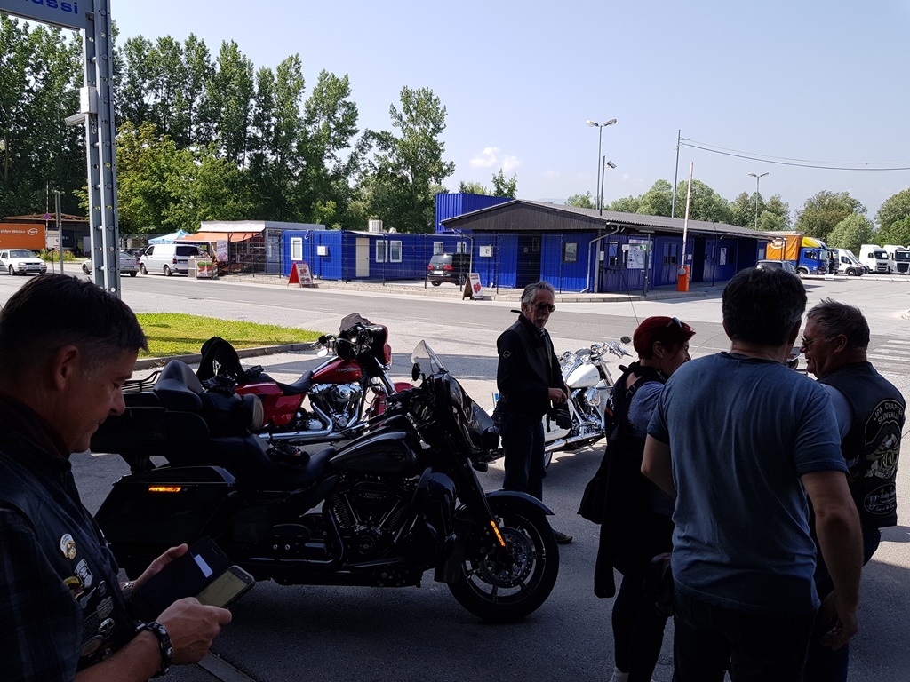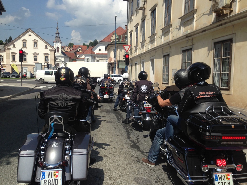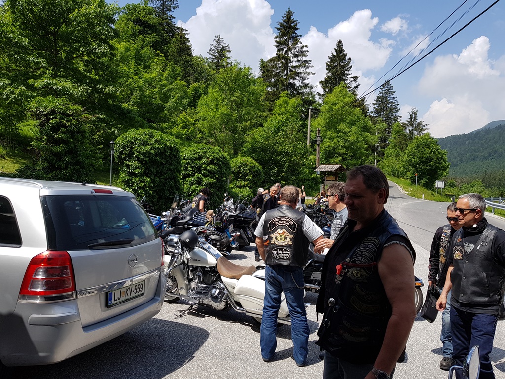 Die Anreise führte über den, offiziell gesperrten, Seebergsattel zur Mittagspause nach Dvorje. Danach ging es weiter nach Ljubljana ins Hotel zum Check-in. Am Abend besuchten wir das LIPA-Chapter beim örtlichen Harley-Dealer. Wir wurden freundlich empfangen und gleich zum Spanferkelschmaus, Kotelett und Cevapcici eingeladen. Grund dafür war auch der Geburtstag des Directors. Bei gutem Essen und ein paar Glas Wein oder Bier machten wir die Tour für den nächsten Tag aus.