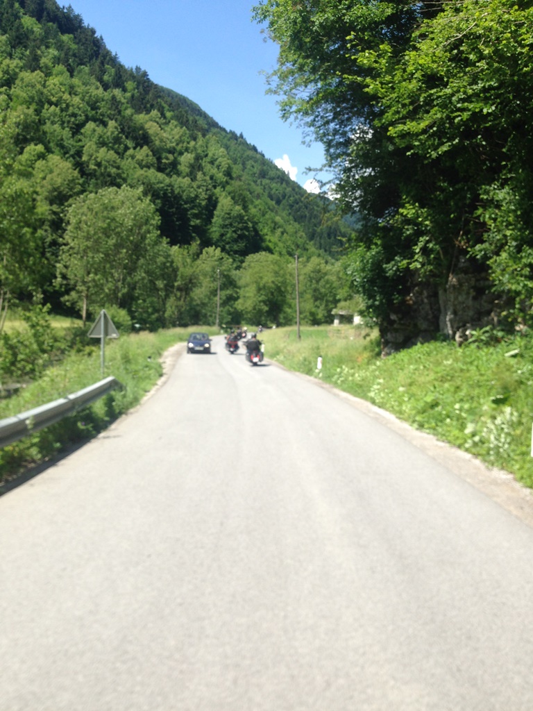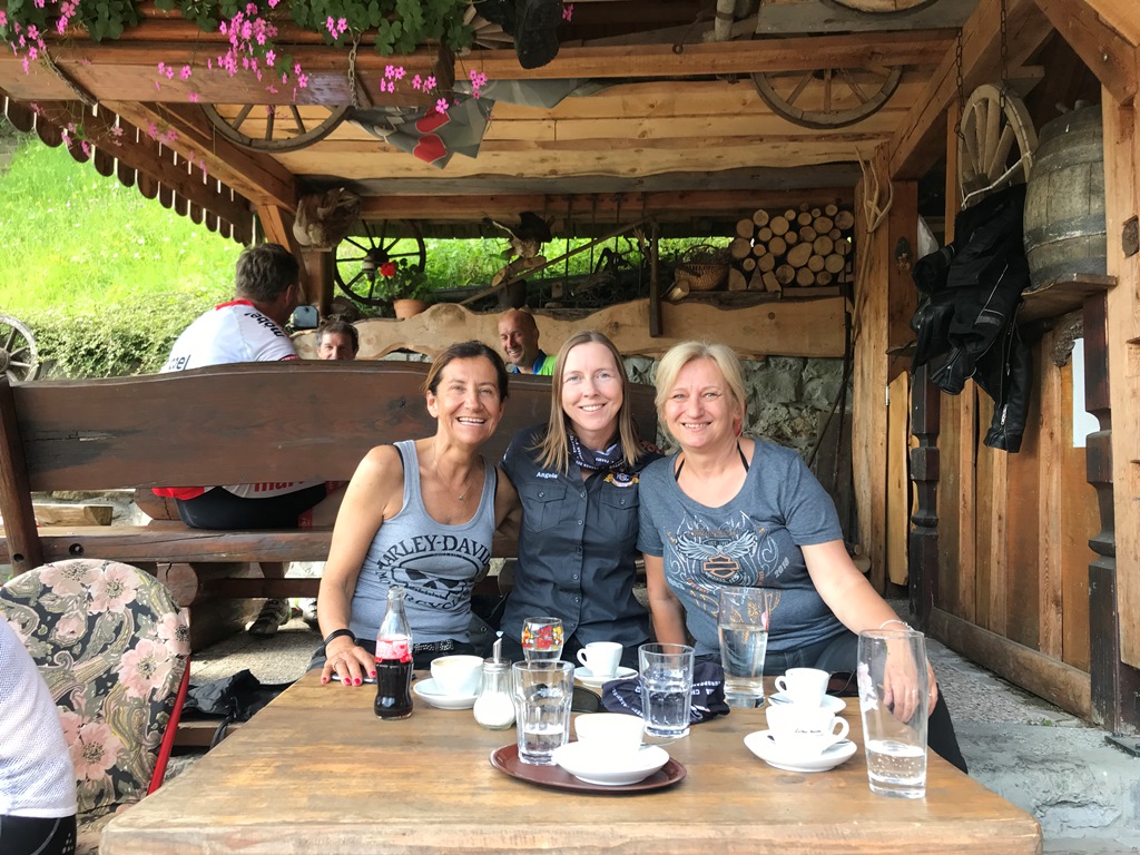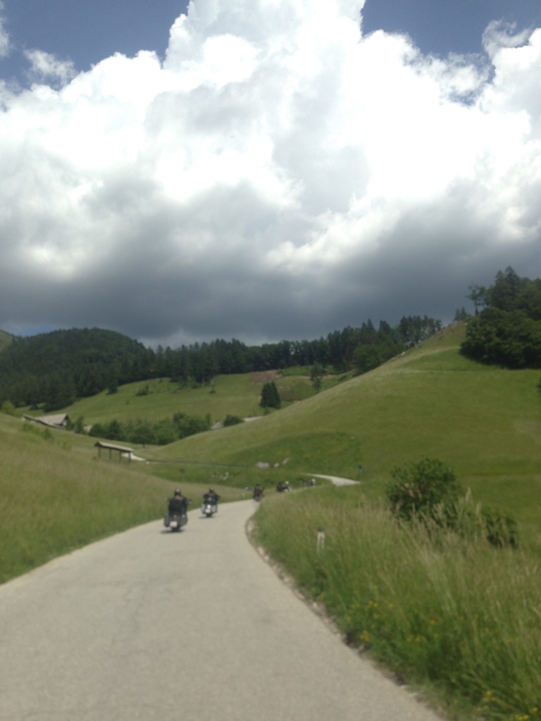Am Sonntag führte Manfred die Tour zurück nach Klagenfurt. Leider gab es unterwegs eine Straßensperre und wir mussten an einer anderen Stelle als geplant, u.zw. im Guesthouse Petrovo Brdo, Halt machen. Danach ging es über eine Umleitung weiter, viele kurvige Straßen bis nach Bohinjska Bistrica und neben der Sava Bohinka nach Bled, weiter über Begunje nach Trzic und über den Loiblpass zurück nach Österreich.